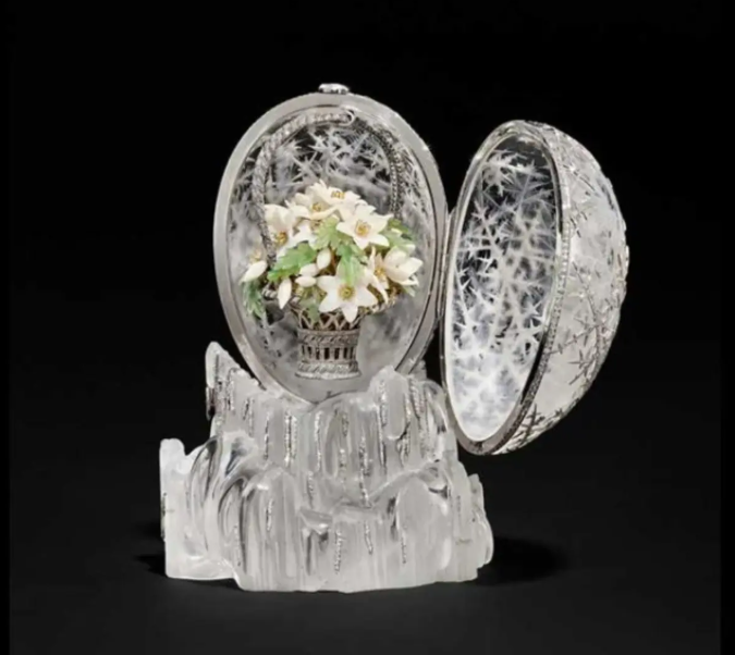 Fabergé yumurtasının bu kadar pahalı olmasının tabii ki kendine göre nedenleri var. Şeffaf kaya kristalinden oyulan yumurta, adeta donmuş bir su damlası gibi görünüyor. Üzerinde tam 4.500 adet elmas ve platin kar tanesi motifi işli. Bunlar da yetmezmiş gibi yumurta açıldığında içinden beyaz kuvars, yeşim ve nadide taşlardan yapılmış minyatür bir çiçek sepeti çıkıyor.