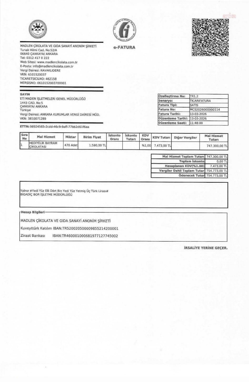 “AKP’nin bayram vurgunu! Tüm Türkiye ekonomik kriz altında ezilirken; Eti Maden Genel Müdürlüğü’nün bayram çikolatası alımı için 14 Milyon 306 bin lira harcama yaptığını tespit ettik. Kamu kaynağıyla binlerce kutu çikolata satın almak ayan beyan kamu zararıdır! 17.05.2024 tarihli Cumhurbaşkanlığı Tasarruf Tedbirleri Genelgesi ortadayken, böyle bir alımın yapılması; Enerji ve Tabii Kaynaklar Bakanı ve Eti Maden Genel Müdürünün de, CB Tayyip Erdoğan’ı takmadığının ispatıdır. Satın alınan 8 bin 180 adet çikolata kutusunun, Eti Maden’deki personel sayısının iki katı olması ayrı bir soru işaretidir. Bunun adı bayram vurgunudur! İşte faturalar. Kaynak: Eti Maden’in bayram çikolatası alımına ilişkin 10 adet fatura, CB Tasarruf Tedbirleri Genelgesi.”