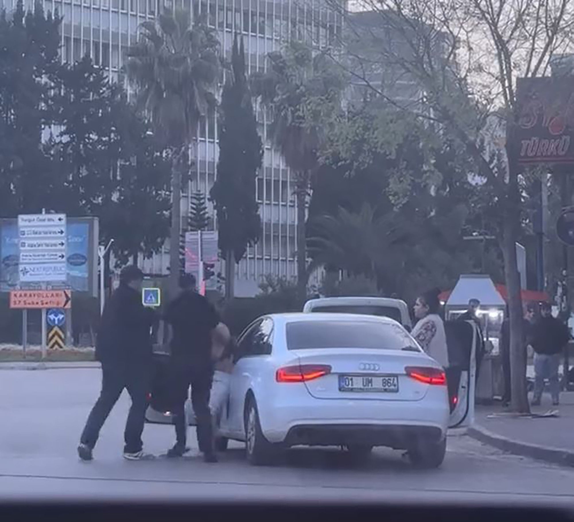 Adana’nın Çukurova ilçesine bağlı Beyazevler Mahallesi’ndeki bir kavşakta dün akşam saatlerinde kimliği henüz belirlenemeyen iki kişi otomobilin içinde tartıştıkları kadını darbederek araçtan indirdi. Şüpheliler, zorla indirdikleri kadını daha sonra yere itti. Kendisini savunan kadın, tartıştığı kişilere vurarak otomobilin yan aynasını kırdı.