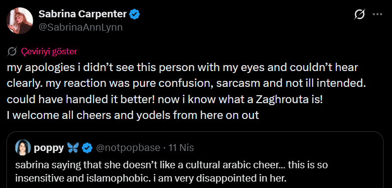 10 Nisan günü dünyaca ünlü müzik festivalinde baş sanatçı olarak sahne alan Sabrina Carpenter, kalabalıktan gelen zılgıt sesiyle birlikte şaşırıp, “Bu senin kültürün mü? Çok garip” gibi ifadeler kullanmıştı.