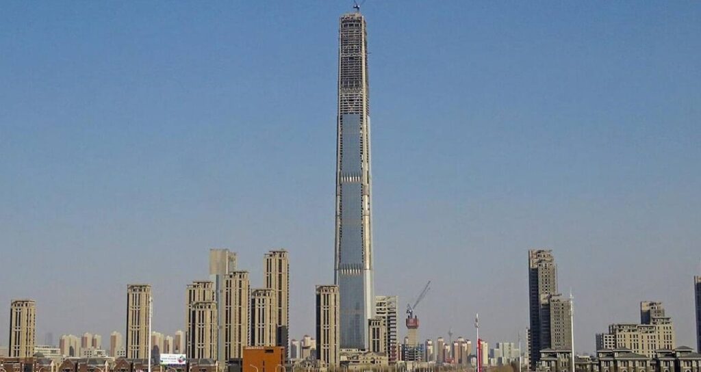 Tianjin liman kentinde yükselen gökdelen, 596 metre yüksekliğiyle tamamlandığında dünyanın en yüksek 5. veya 6. binası unvanını alacak. 2009 yılında temeli atılan ancak 10 yıla yakın süredir atıl durumda kalan proje, Çin’in gayrimenkul piyasasını istikrara kavuşturma ve piyasa güvenini yeniden tesis etme hamlesinin merkezinde yer alıyor. İnşaatın nihai olarak 2027 yılında tamamlanması hedefleniyor.