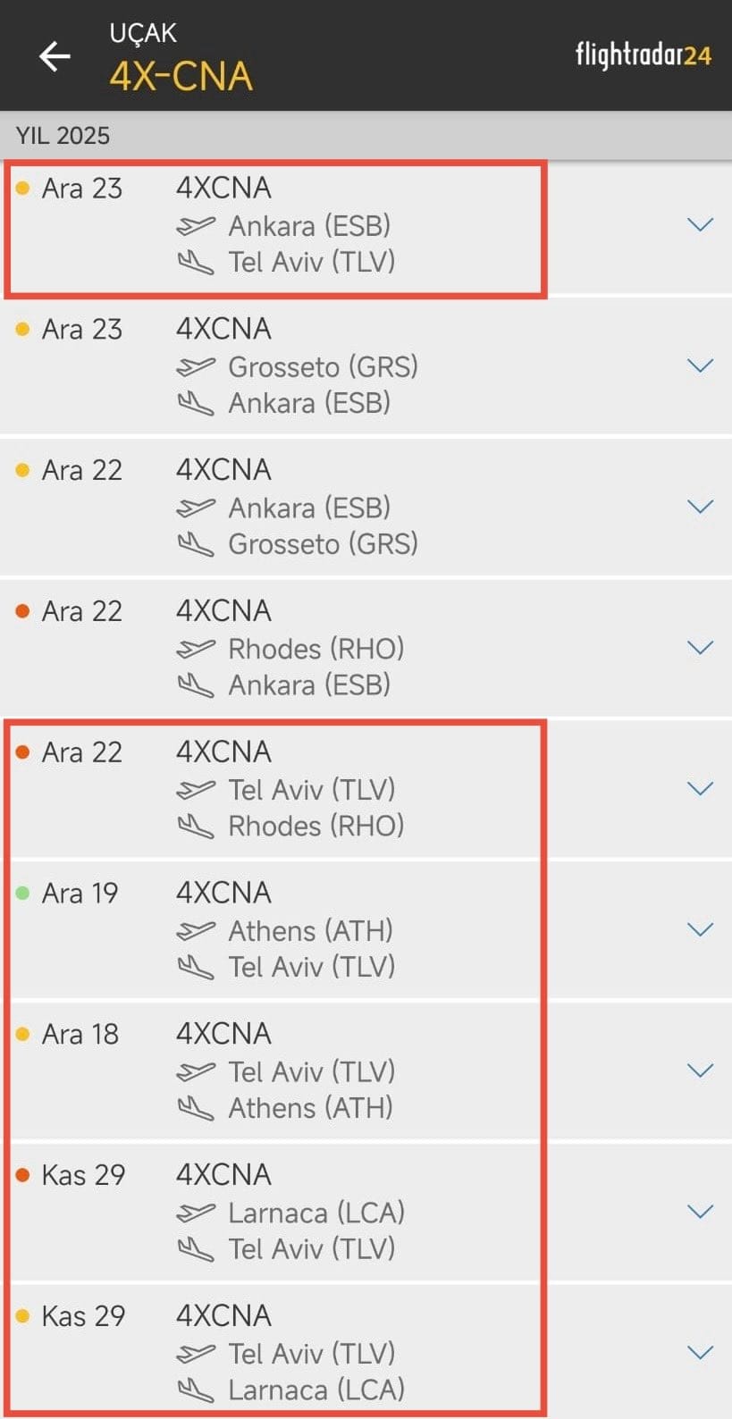 Yine aynı gün, 4X-CNA tescil numaralı bir İsrail jeti Esenboğa’ya indi ve o da Libya jetinin bulunduğu 5 numaralı aprona yönlendirildi. Böylece iki düşman ülke uçağı, 1 saat 41 dakika boyunca aynı apronda bir araya getirilmiş oldu.