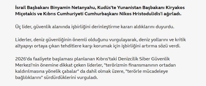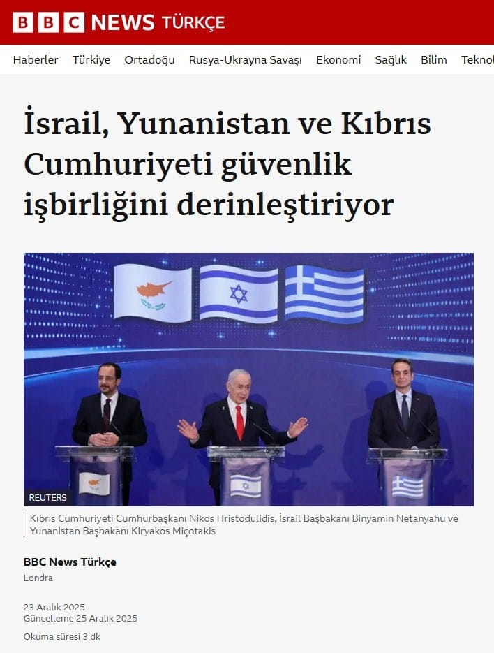 Bir gün sonra, 23 Aralık 2025’te Libya askeri heyeti Türkiye’deki yetkililerle gün boyunca görüşmeler yaptı. Aynı gün İsrail Başbakanı Netanyahu; Yunanistan ve Güney Kıbrıs Rum Yönetimi liderleriyle Kudüs’te bir araya gelerek Doğu Akdeniz’de güvenlik alanındaki iş birliklerini derinleştirme kararı aldıklarını tüm dünyaya duyurdu. Toplantıda, “Birlikte güç yoluyla istikrarı, güç yoluyla refahı ve en önemlisi güç yoluyla barışı getireceğiz,” ifadeleri kullanıldı.