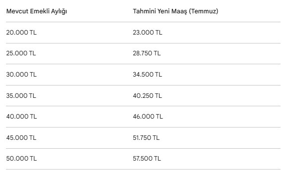 Erdursun’un paylaştığı yüzde 15’lik olası artış oranının maaşlara yansıması durumunda, emekli aylıklarında oluşacak yeni tablo şu şekilde öngörülüyor: