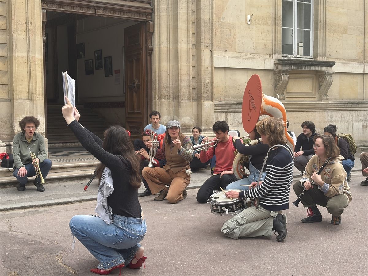 ENS’nin İsrailli üniversitelerle işbirliğine karşı çıkan öğrenciler, okullarının bu üniversitelerle ortaklık anlaşmalarını askıya alması çağrısıyla müzikli eylem yaptı.