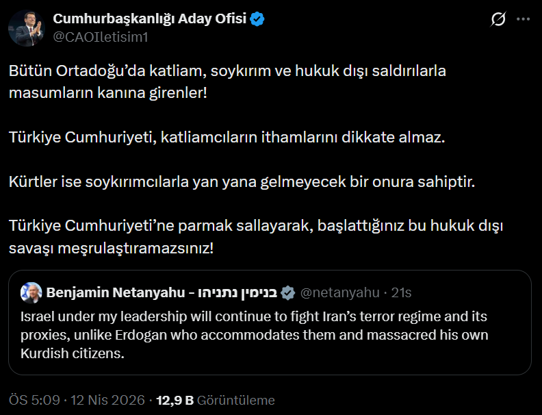 İsrail Başbakanı Binyamin Netenyahu dün yaptığı sosyal medya paylaşımında “Benim liderliğim altındaki İsrail, İran’ın terör rejimi ve onun vekilleriyle mücadeleye devam edecek; oysa Erdoğan, bu güçlere taviz veriyor ve kendi Kürt vatandaşlarını katlediyor” ifadelerine yer vermiş, bu açıklamalar birçok siyasi tarafından tepkiyle karşılanmıştı.