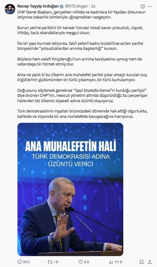 Cumhurbaşkanı Recep Tayyip Erdoğan, sosyal medya hesabından bir paylaşım yaptı. CHP lideri Özel ve parti yönetimini hedef alan Erdoğan şu ifadeleri kullandı: