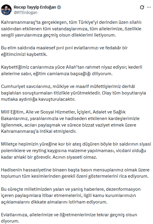 “Kahramanmaraş’ta gerçekleşen, tüm Türkiye’yi derinden üzen silahlı saldırıdan etkilenen tüm vatandaşlarımıza, tüm ailelerimize, özellikle sevgili yavrularımıza geçmiş olsun dileklerimi iletiyorum. Bu elim saldırıda maalesef pırıl pırıl evlatlarımızı ve fedakâr bir eğitimcimizi kaybettik.