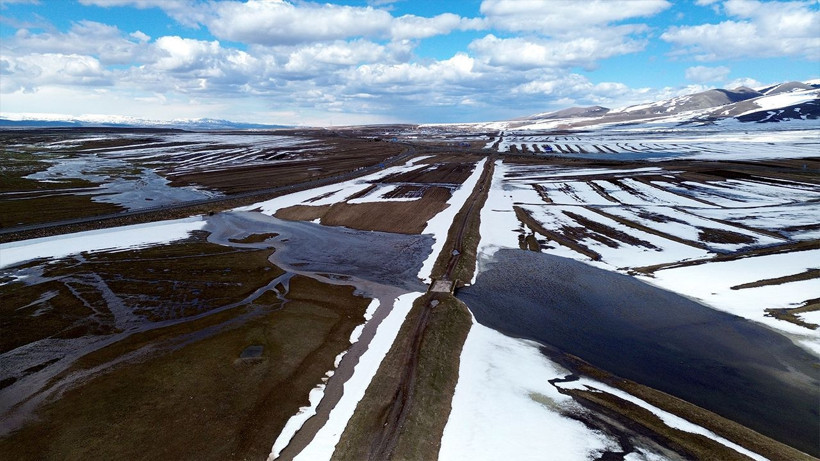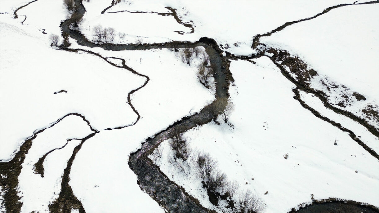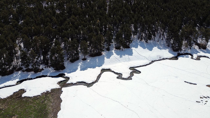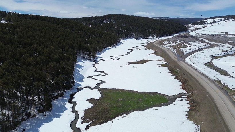 Sarıçam ormanları arasında karların erimesiyle ortaya çıkan dereler, kar sularıyla kaplanan tarım alanları dronla görüntülendi.