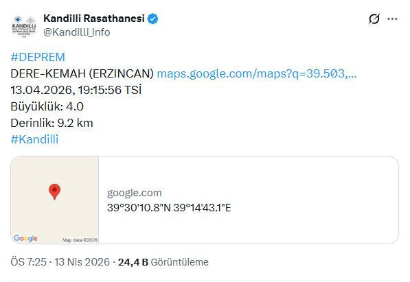 Kandilli Rasathanesi’nin sosyal medya adresinden yapılan açıklamaya göre, . Erzincan’da 19.15 sıralarında 4.0 büyüklüğünde bir deprem meydana geldi.