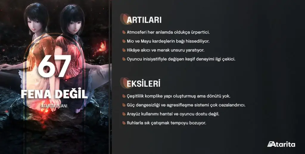Değindiğim yerleri göz önünde bulundurarak oyun çıktığında nasıl bir yol izleyecek, gözlemleyin derim. Şayet tasarım seçimleri harici bahsettiğim dengesizlik unsurları giderilirse eksi ve artılarını tartarak oyuna şans verebilirsiniz. Hikâyesi ve atmosferi, özellikle Japon korkularını sevenler için oyunu yalnızca o kısımlarıyla sınırlı aldığımızda mutlaka şans verilmesi gereken bir tecrübe sunuyor. Fakat çatışma sekanslarını ağırlıklı olarak etkileyen dengesiz tasarım seçimleri, sürecin kalitesini soru işaretleriyle dolduruyor.