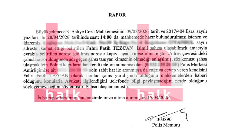 Polis tarafından aranan Tezcan, adresinde bulunamadı. POLNET sisteminde kayıtlı numaradan aranan Tezcan, polis memuruna yurt dışında olduğunu ve adresini paylaşmayacağını söyledi.