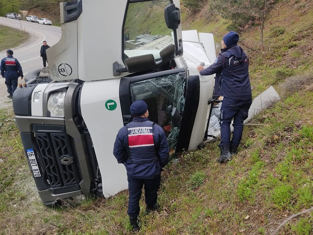 Freni boşalan TIR virajda devrildi! Şoför cam kırılarak çıkarıldı