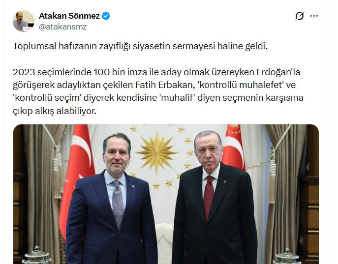 “2023 seçimlerinde 100 bin imza ile aday olmak üzereyken Erdoğan’la görüşerek adaylıktan çekilen Fatih Erbakan, ‘kontrollü muhalefet’ ve ‘kontrollü seçim’ diyerek kendisine ‘muhalif’ diyen seçmenin karşısına çıkıp alkış alabiliyor.”