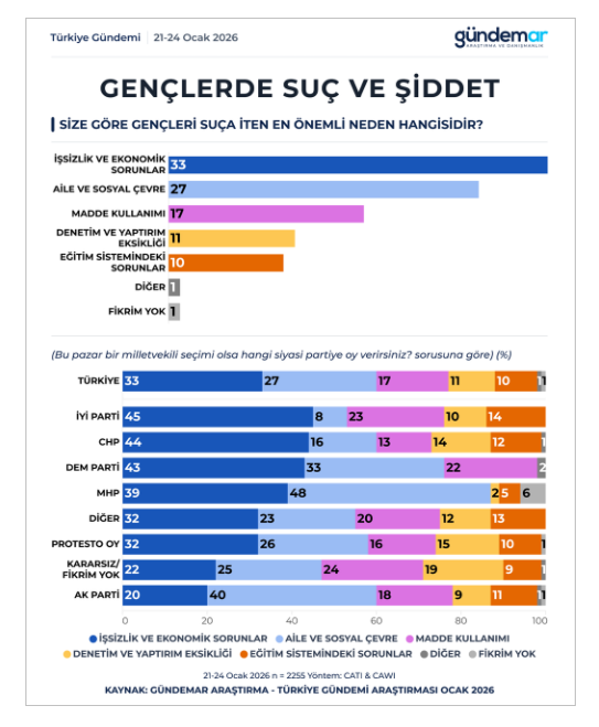 Bu sonuç, kamu otoritesine yönelik memnuniyetsizliğin yüksek olduğunu gösterdi. Konuya ilişkin yapılan değerlendirmede, “Ocak 2026 verileri, Türkiye toplumunda güvenlik kaygısının büyüdüğünü, suç olaylarının arttığı yönündeki kanaatin güçlendiğini ve özellikle gençler arasında suç ve şiddet eğilimine ilişkin çok güçlü bir toplumsal alarm oluştuğunu ortaya koyuyor. Kamuoyu, gençlerdeki umutsuzluk ile suç ve şiddet arasında doğrudan bağ kuruyor; bu sorunun temel nedenlerini ise öncelikle ekonomik darboğaz, aile ve sosyal çevre ile madde kullanımı ekseninde değerlendiriyor. Aynı zamanda ceza sistemine duyulan güvenin zayıf olması ve devletin mücadele kapasitesinin yetersiz bulunması, toplumun meseleyi yalnızca asayiş değil, aynı zamanda adalet ve kamu otoritesi sorunu olarak gördüğünü düşündürüyor. Araştırmanın ortaya koyduğu temel mesaj açık: Toplum, suç ve şiddet karşısında daha etkili, daha görünür ve daha güven veren bir mücadele talep ediyor” ifadelerine yer verildi.