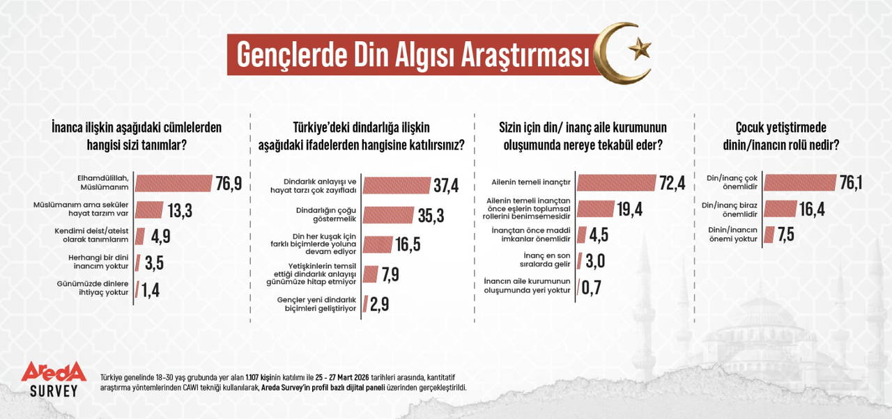 Areda Survey, 25-27 Mart 2026 tarihleri arasında Türkiye genelinde 1.107 gencin katılımıyla “Gençlerde Din Algısı” araştırmasını gerçekleştirdi. Sonuçlar, gençlerin manevi dünyasındaki güçlü inanç bağı ile kurumsal dindarlığa yönelik eleştirel bakışı arasındaki dengeyi gözler önüne serdi.