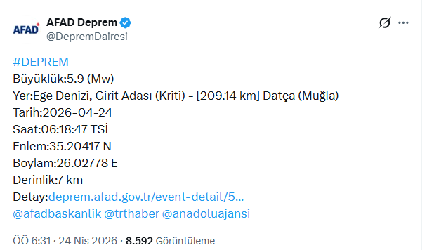 Girit Adası’nda saat 06.18’de 5,9 büyüklüğünde deprem meydana geldi. 7 km derinlikte meydana gelen değrem, Mupla’ya 210 km uzaklıkta gerçekleşti