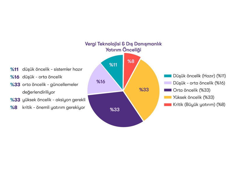 Gelir İdaresi’nin e-defter ve e-fatura analizlerinde yapay zekâ kullanımını artırmasıyla birlikte, işletmelerin uyum yatırımlarına verdiği öncelik de yükseliyor. Katılımcıların %74’ü bu alanda orta-yüksek-kritik öncelik atadığını belirtiyor. Bu eğilim yalnızca vergi mükellefi şirketleri değil, onlara denetim ve danışmanlık hizmeti sunan kuruluşları da doğrudan etkiliyor: GİB’in artan dijital denetim kapasitesi karşısında hizmet sağlayıcıların teknolojiyi özümsemeleri, müşterilerine etkin destek sunabilmelerinin ön koşulu haline geliyor.