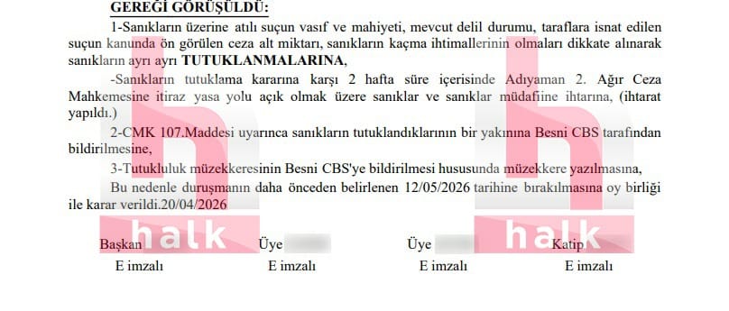Öte yandan mahkeme, 20 Nisan 2026 tarihli kararla sanıklar Kadir Korkut ve Ayşe Gündüz hakkında tutuklama kararı verdi. Sanıklar, Adıyaman L Tipi Kapalı Ceza İnfaz Kurumu’na gönderildi.