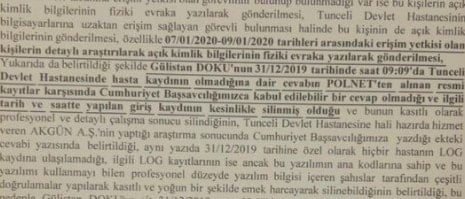 Dosyaya giren belgelerde, kurtarılabilen veri parçalarında gebelikle ilgili olabileceği değerlendirilen tıbbi başlıkların yer aldığı da belirtildi. Bu kapsamda Başsavcılık, silinen kayıtların Doku’nun gebelik durumuna ilişkin bilgi içerip içermediğinin araştırılmasını istedi. Öte yandan 7-9 Ocak 2020 tarihleri arasında hastane sistemine erişerek kayıtları silen kişi ya da kişilerin kimliğinin tespiti için çalışmaların sürdüğü bildirildi.