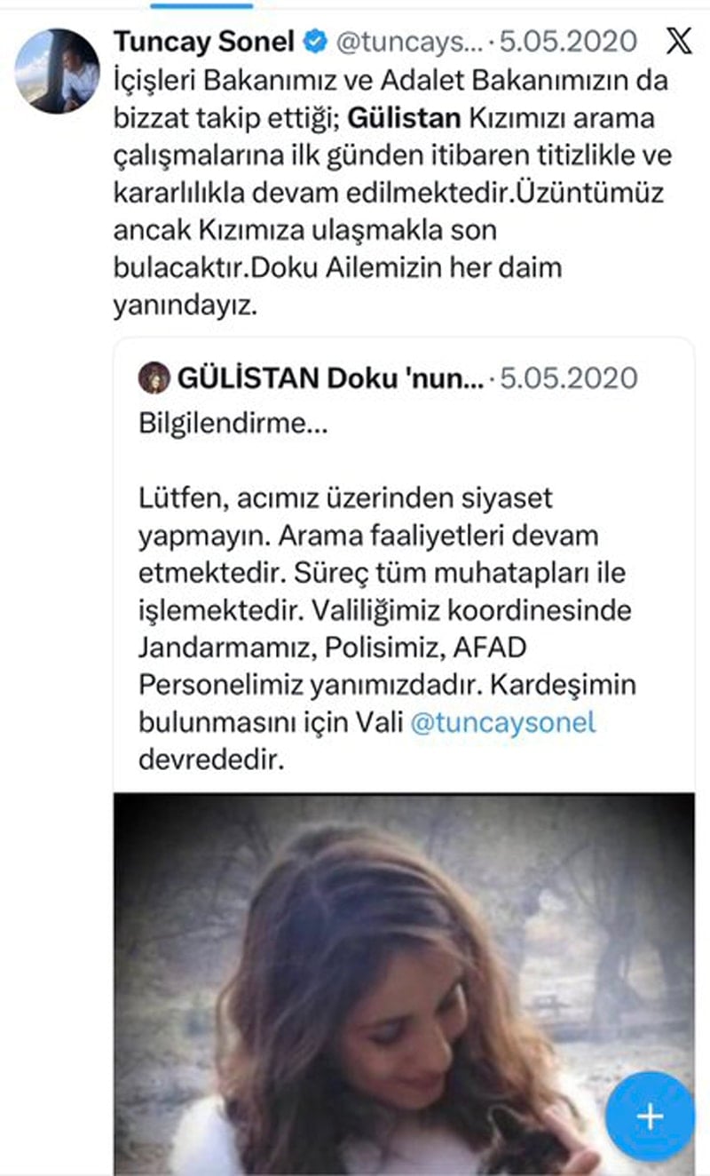 Üniversiteli Gülistan Doku davasında, dönemin Tunceli Valisi’nin oğlu dahil çok sayıda gözaltı yapılırken, eski İçişleri Bakanı Süleyman Soylu’nun çözüme odaklanmak yerine muhalefeti hedef aldığı ortaya çıktı. Soylu, polisin “insanüstü gayretine” rağmen Kemal Kılıçdaroğlu ve Meral Akşener’in siyasi rant için olayı suistimal ettiğini savundu. Olaydan iki yıl sonra konuşan Soylu, “Devletin tüm imkanlarıyla samimi bir gayret gösterdik” dese de sonuç alınamadı.