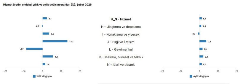 Türkiye İstatistik Kurumu(TÜİK), 2026 yılı Şubat ayına ilişkin Hizmet Üretim Endeksi verilerini açıkladı. Yıllık bazda yüzde 2,3 oranında büyüme kaydeden hizmet sektörü, aylık bazda da yüzde 1,2’lik bir artış sergileyerek performansını yukarı taşıdı. Şubatta sektörün en dikkat çeken gelişmesi, teknoloji odaklı hizmetlerdeki sert yükseliş ile gayrimenkul ve ulaştırma kanadındaki durgunluk oldu.