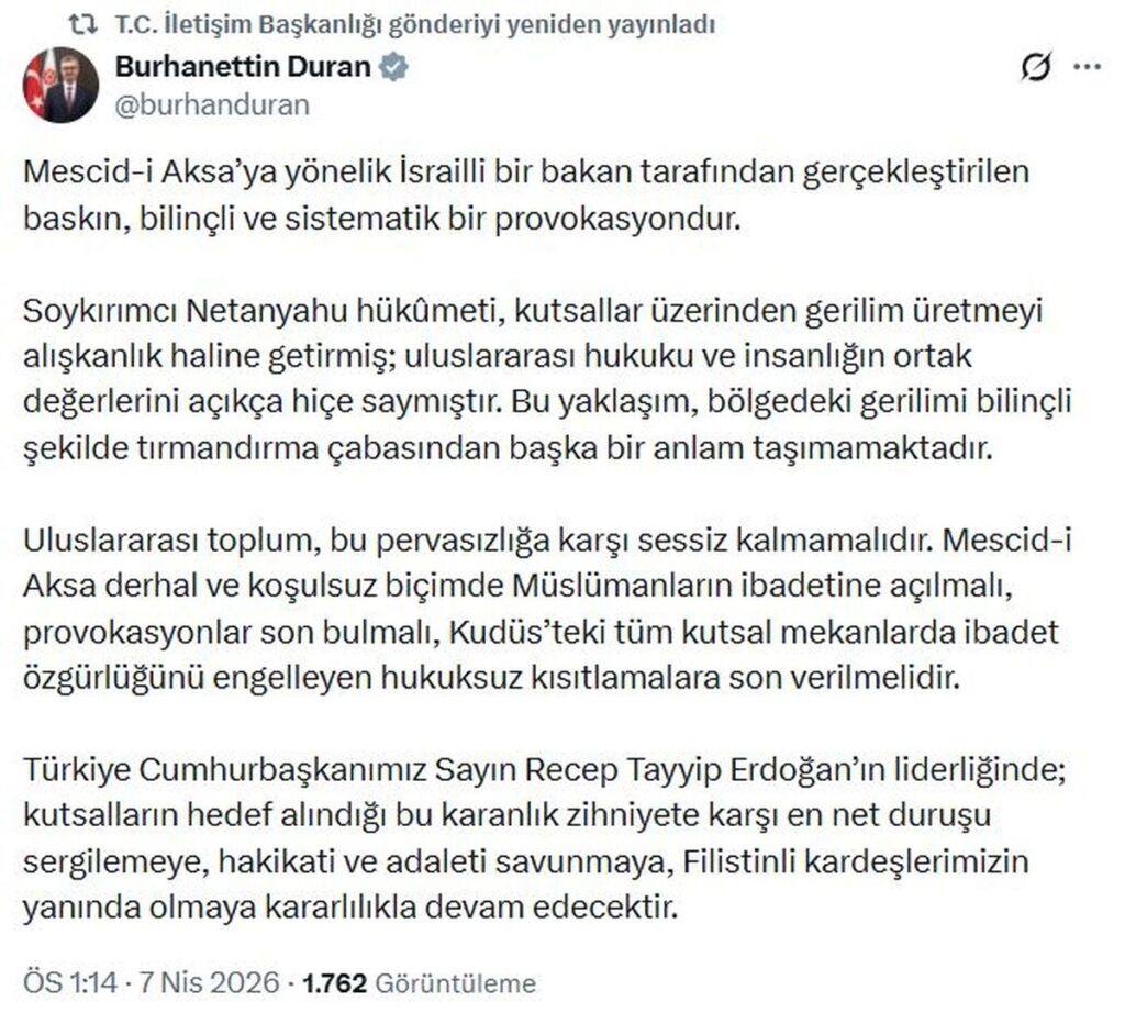 İLETİŞİM Başkanı Burhanettin Duran, “Mescid-i Aksa’ya yönelik İsrailli bir bakan tarafından gerçekleştirilen baskın, bilinçli ve sistematik bir provokasyondur” dedi.