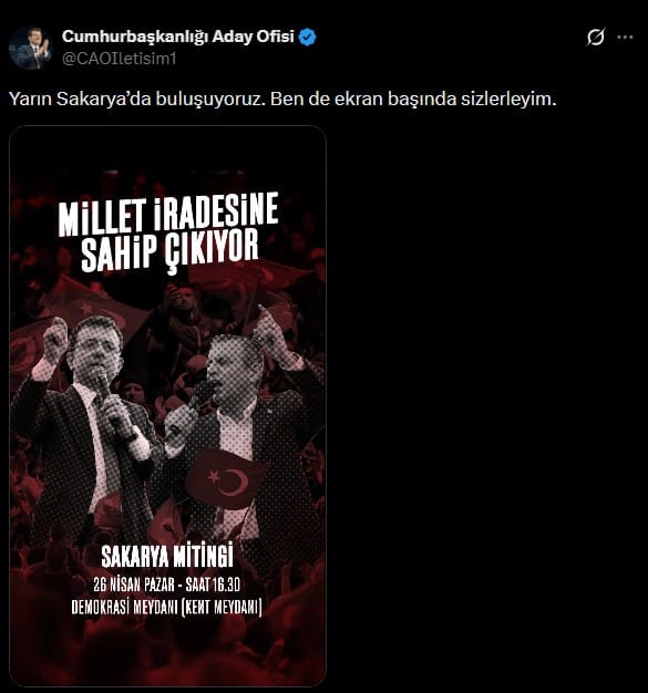 İmamoğlu’nun miting çağrısı, “Cumhurbaşkanlığı Aday Ofisi” isimli sosyal medya hesabı üzerinden paylaşıldı. 26 Nisan’daki buluşmanın yer ve zaman bilgilerinin hatırlatıldığı paylaşımda, İmamoğlu’nun mesajı doğrudan seçmenlere ulaştırıldı.