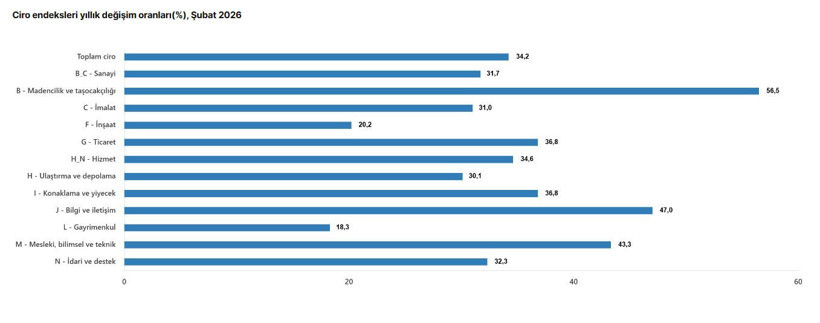 Türkiye ekonomisinin ana sektörlerini kapsayan ciro endeksleri 2026 yılı Şubat ayında hem yıllık hem de aylık bazda yükseliş grafiği gösterdi. Türkiye İstatistik Kurumu(TÜİK) verilerine göre; sanayi, inşaat, ticaret ve hizmet sektörlerinin toplam, performansını yansıtan ciro endeksi yıllık bazda yüzde 34,2 oranında artırdı.