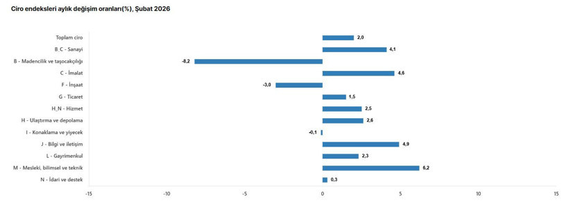 Ekonominin toplam cirosu bir önceki aya (Ocak 2026) göre %2,0 oranında artış kaydetti. Aylık bazda sektörler arasında keskin ayrışmalar görüldü. Aylık yüzde 4,1 artış gösteren sanayi sektörü, kısa vadeli büyümenin itici gücü oldu. Hizmet sektörü aylık yüzde 2,5, ticaret sektörü ise yüzde 1,5 oranında ivme kazandı.