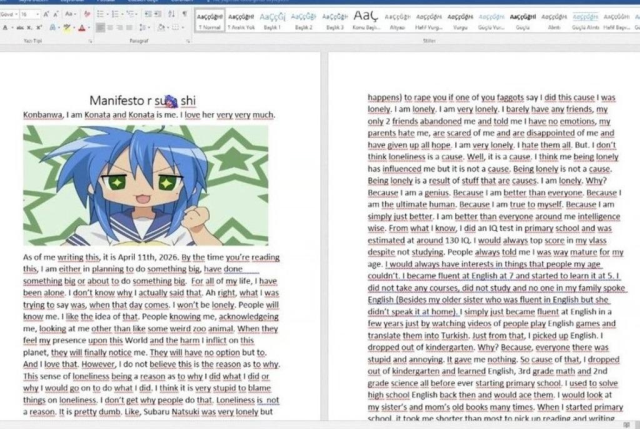 “Bunu yazarken tarih 11 Nisan 2026. Sen bunu okuduğunda ya bir şey planlıyor olacağım, yapmış olacağım ya da yapmak üzere olacağım. Hayatım boyunca hep yalnız kaldım. Nedenini bilmiyorum, aslında çok fazla şeyim vardı. Hep insanlarla kaynaşmaya çalıştım ama yalnız kaldım. İnsanların beni tanıması, fark etmesi hoşuma gidiyor. Bu dünyadaki varlığımı ve verdiğim zararı hissetsinler istiyorum ki sonunda beni fark etsinler.”