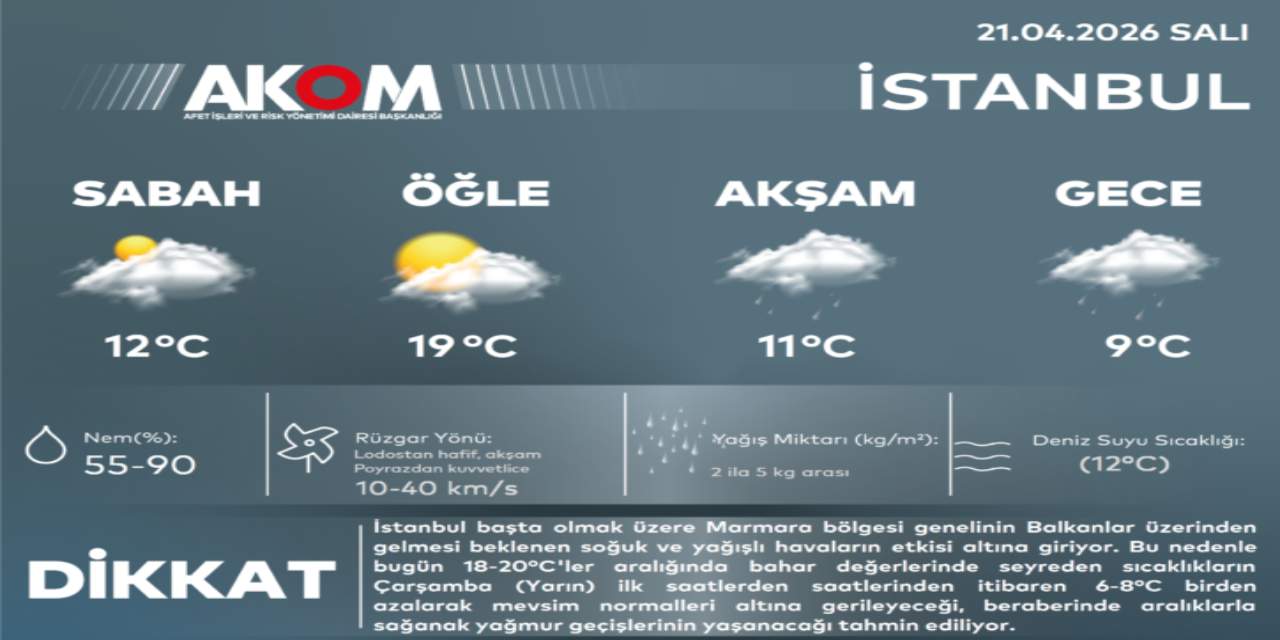 Daha önce dün akşam saatlerinde başlaması öngörülen ani değişim için tahminler değişti. İBB AKOM tarafından paylaşılan verilere göre, 21 Nisan Salı günü öğle saatlerinde 19°C’ye kadar yükselen bahar havası, akşam saatlerinden itibaren yerini Balkanlar üzerinden gelen soğuk ve yağışlı havaya bırakacak.