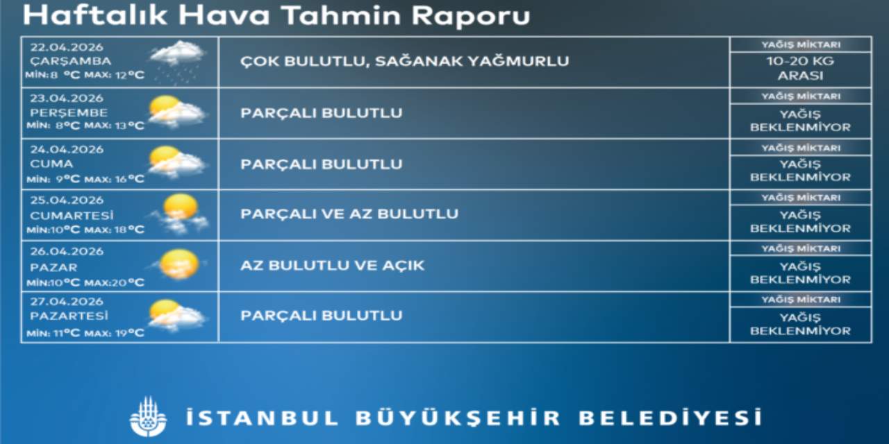 22.04.2026 Çarşamba: Çok bulutlu, sağanak yağmurlu. (Min: 8°C / Max: 12°C) – Yağış: 10-20 kg.