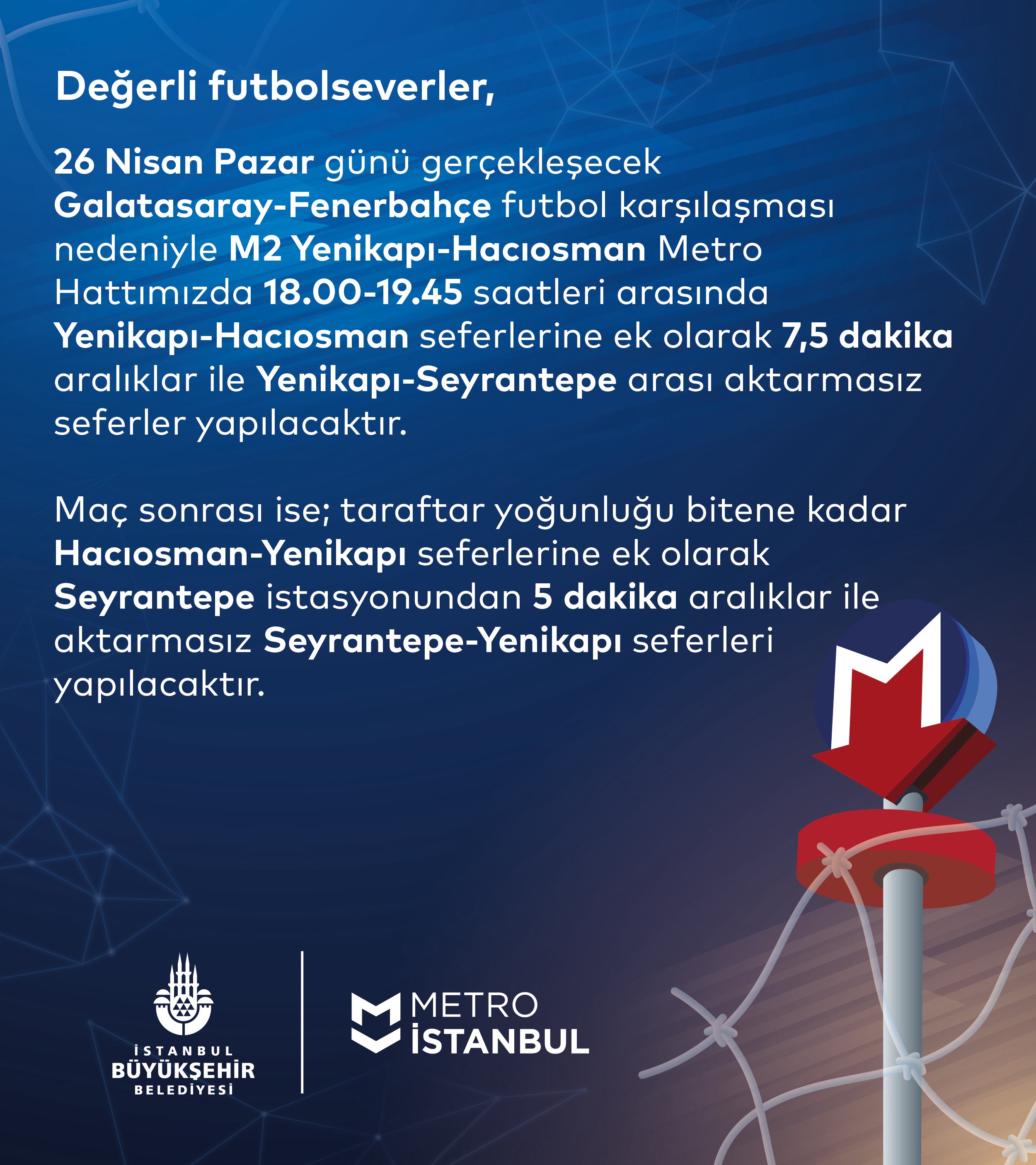 “26 Nisan Pazar günü gerçekleşecek Galatasaray-Fenerbahçe futbol karşılaşması nedeniyle M2 Yenikapı-Hacıosman Metro Hattımızda 18.00-19.45 saatleri arasında Yenikapı-Hacıosman seferlerine ek olarak 7,5 dakika aralıklar ile Yenikapı-Seyrantepe arası aktarmasız seferler yapılacaktır. Maç sonrası ise; taraftar yoğunluğu bitene kadar Hacıosman-Yenikapı seferlerine ek olarak Seyrantepe istasyonundan 5 dakika aralıklar ile aktarmasız Seyrantepe-Yenikapı seferleri yapılacaktır.”