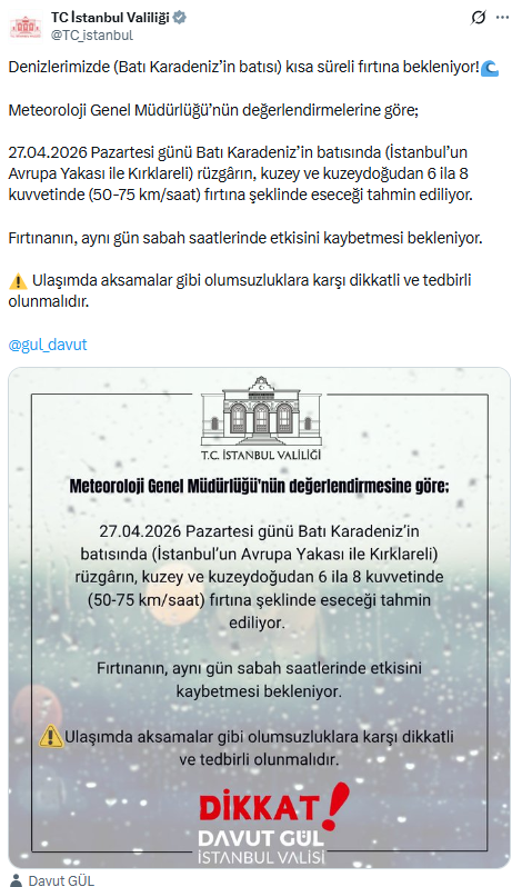 Valiliğin sosyal medya hesabından yapılan açıklamada, Meteoroloji Genel Müdürlüğü’nün değerlendirmelerine göre, yarın Batı Karadeniz’in batısında (İstanbul’un Avrupa Yakası ile Kırklareli) rüzgarın, kuzey ve kuzeydoğudan 6 ila 8 kuvvetinde (50-75 km/saat) fırtına şeklinde eseceğinin tahmin edildiği kaydedildi.