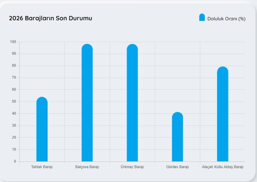 Ege Bölgesi’nde etkisini gösteren yoğun yağışlar İzmir’in su sorununa köklü bir çözüm sundu. Geçtiğimiz yıllarda ciddi bir kuraklık kriziyle karşı karşıya kalan kentte baraj doluluk oranları 2026 yılı itibarıyla güvenli seviyeleri geride bıraktı. İzmir Su ve Kanalizasyon İdaresi (İZSU) tarafından yayımlanan güncel veriler havzalardaki su miktarının tarihi bir yükseliş grafiği çizdiğini belgeledi.