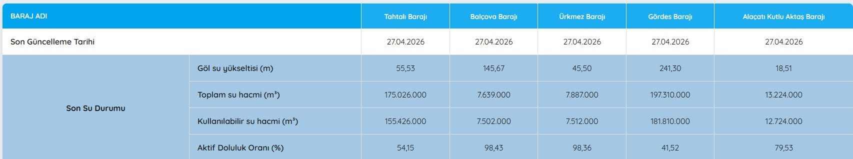 İZMİR BARAJLARINDA 27 NİSAN 2026 GÜNCEL DOLULUK ORANLARI (İZSU VERİLERİ)