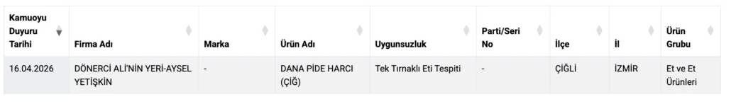 Bakanlık ekiplerinin gerçekleştirdiği rutin denetimler sonucunda, İzmir’in Çiğli ilçesinde hizmet veren “Dönerci Ali’nin yeri” isimli işletmeden alınan numuneler laboratuvar ortamında incelendi. Yapılan analizler neticesinde, menüde “dana pide” olarak satışa sunulan ürünün harcında tek tırnaklı hayvan eti bulunduğu tespit edildi.