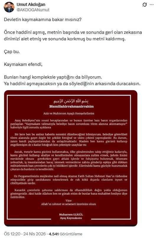 Açıklamaya CHP Ankara Milletvekili Umut Akdoğan sosyal medya platformu X üzerinden tepki gösterdi. Akdoğan, “Devletin kaymakamına bakar mısınız? Önce haddini aşmış, metnin başında ve sonunda geri olan zekasına dinimizi alet etmiş ve sonunda korkmuş bu metni kaldırmış. Çap bu. Kaymakam efendi, Bunları hangi kompleksle yaptığını da biliyorum. Ya haddini aşmayacaksın ya da söylediğinin arkasında duracaksın” ifadelerini kullandı.