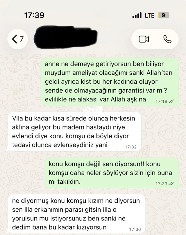 Genç kadının ise mesajlara tepki gösterdiği görüldü. “Ben biliyor muydum ameliyat olacağımı, ayrıca kist bu her kadında oluyor, evlilikle ne alakası var” diyerek sağlık durumunun evlilikle ilişkilendirilmesine karşı çıktı. Tartışmanın ilerleyen kısmında ise “Konu komşu değil sen diyorsun” sözleriyle kaynanasına tepki gösterdi. Mesajların devamında kaynananın, “İlla Erkan’ımın parası gitsin, illa o yorulsun mu istiyorsunuz” şeklindeki ifadeleri de dikkat çekti.