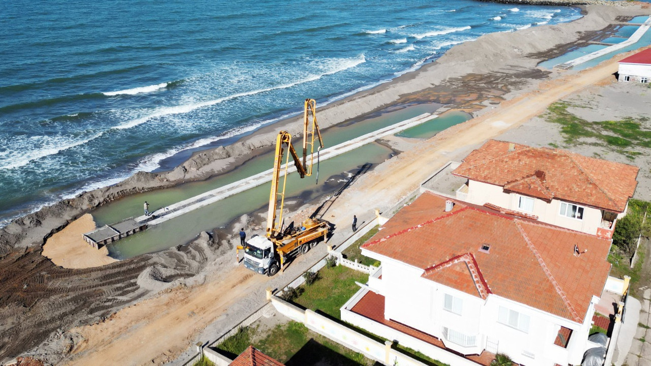 Karasu Mahallesi’nde dalgaların neden olduğu erozyonla tahrip olan sahil ve burada bulunan tatil köyü, villa ile havuz tesisinin bulunduğu alanda, Ulaştırma ve Altyapı Bakanlığınca sahil koruma duvarı çalışması başlatıldı.