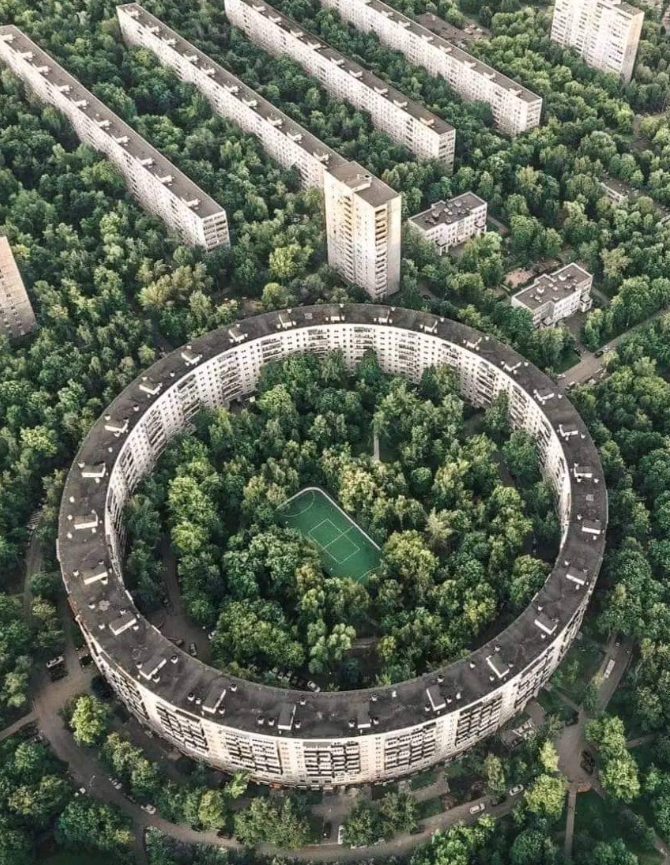 Moskova’nın Ochakovo-Matveyevskoye bölgesinde bulunan dairesel binalar, koca bir şehri andıran devasa bir kapasiteye sahip. Yaklaşık 155 metrelik dış çapa sahip olan yapılar, ortasında geniş bir iç avlu ve spor alanları barındırıyor. Sovyet döneminin mühendislik gücünü simgeleyen bu tasarımda; dükkanlar, eczaneler ve sosyal alanlar aynı yuvarlağın içinde bulunuyor.