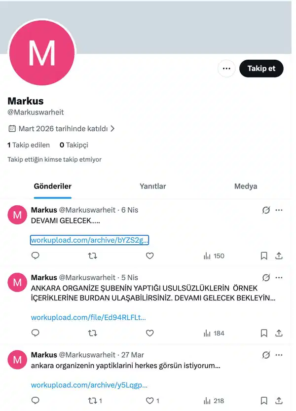 Hiç takipçisi olmayan ve sadece Emniyet’in gizli verilerini paylaşmak üzere açıldığı anlaşan hesaptan 27 Mart 2026, 5 Nisan 2026 ve 6 Nisan 2026 tarihlerinde yapılan üç ayrı paylaşıma eklenen dosya uzantılarında, Emniyet Genel Müdürlüğü Kaçakçılık ve Organize Suçlarla Mücadele Başkanlığı’na ait gizli verilerin bulunduğu iddia edildi.
