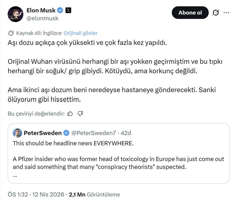 Öte yandan teknoloji dünyasının liderlerinden Elon Musk da aşı deneyimine ilişkin kişisel bir değerlendirmede bulundu. Musk, Kovid-19’u aşı olmadan önce geçirdiğini belirterek şu ifadeleri kullandı:
