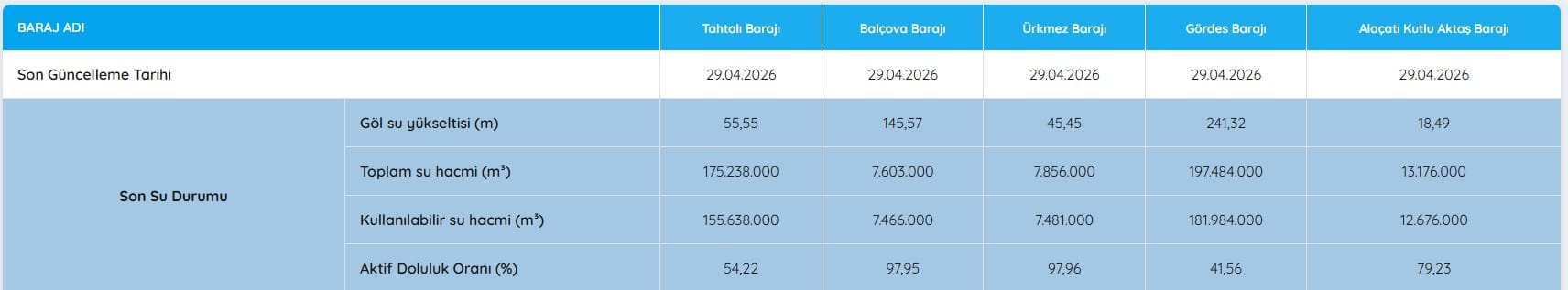 İZMİR BARAJLARINDA 29 NİSAN 2026 GÜNCEL DOLULUK ORANLARI (İZSU VERİLERİ)