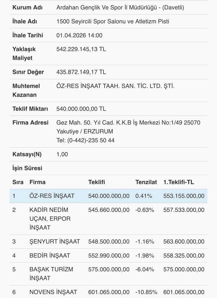 Türkiye’des ekonomik kriz etkisini sürdürürken, kamu ihalelerinde tercih edilen yöntemlere yönelik tartışmalar da büyüyor. Muhalefetin kamu ihalelerinde şeffaflık eleştirileri sürerken, Ardahan’da yapılması planlanan spor tesisi ihalesinin sınırlı katılımla gerçekleştirilmesi dikkat çekti. Yaklaşık maliyeti 542 milyon 229 bin 145 TL olan proje için düzenlenen ihaleye sadece belirlenen firmalar çağrıldı.