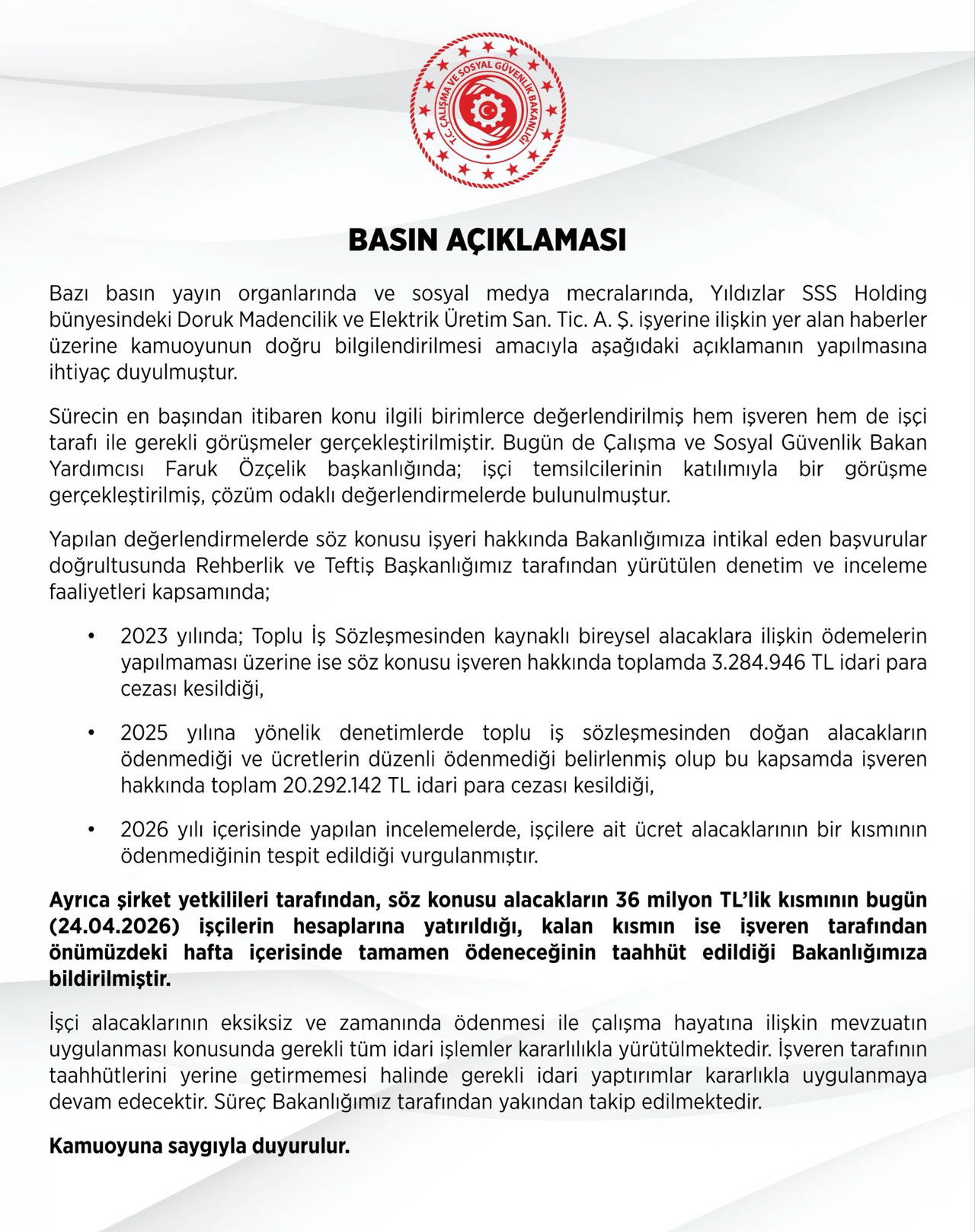 Bakanlık açıklamasında, şirket yetkililerinin işçilere olan borçların 36 milyon TL’lik kısmını 24 Nisan 2026 itibarıyla hesaplara yatırdığı bildirildi. Kalan alacakların ise önümüzdeki hafta içinde tamamen ödeneceğinin taahhüt edildiği ifade edildi.
