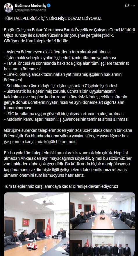 Bağımsız Maden İş Sendikası tarafından yapılan açıklamada, bakanlıkta gerçekleştirilen görüşmede işçilerin tüm taleplerinin iletildiği belirtildi.