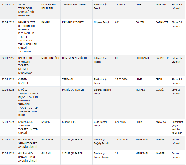 Güncellenen listede, özellikle temel gıda maddelerindeki uygunsuzluklar öne çıktı: