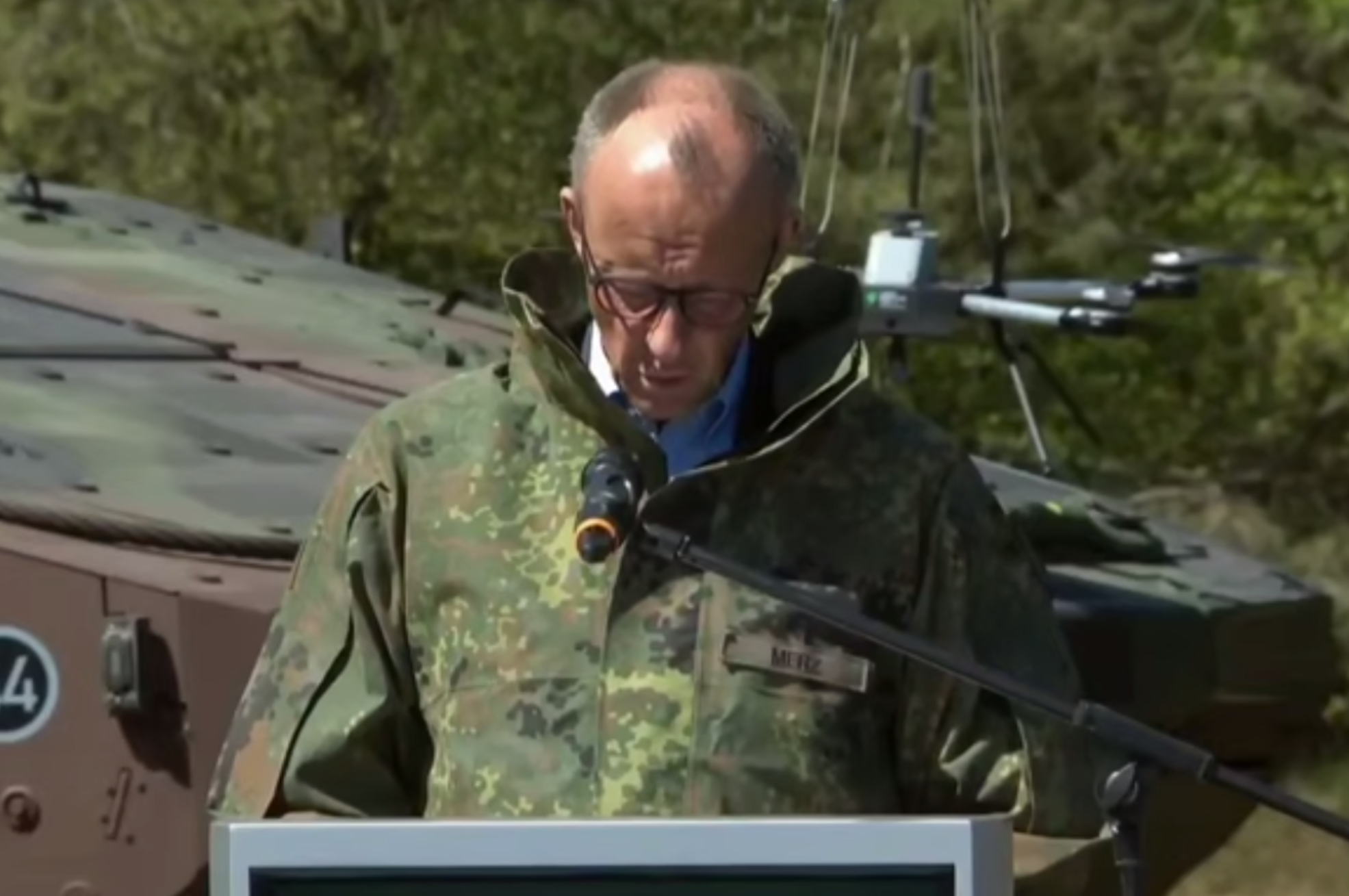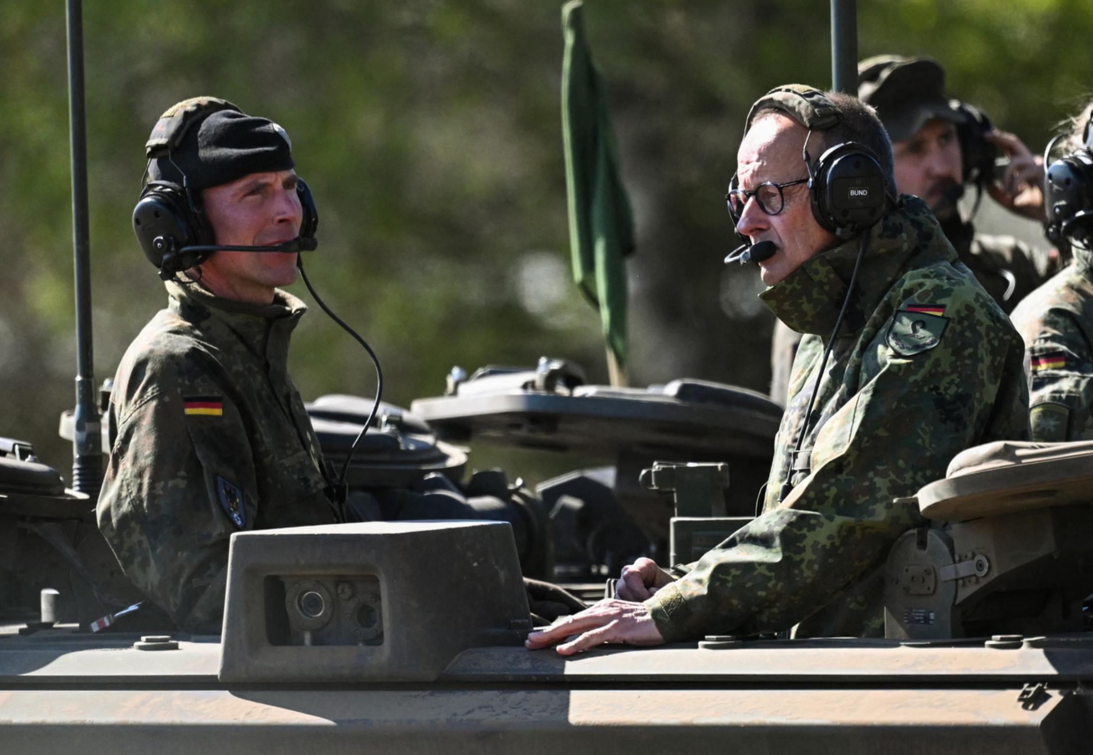 Üstüne kamuflajları çeken Merz, Munster’deki askeri üsteki ziyaretinde bizzat tanka bindi ve kafasında tank komutanı kulaklığını takarak askeri güçleri yönetti.